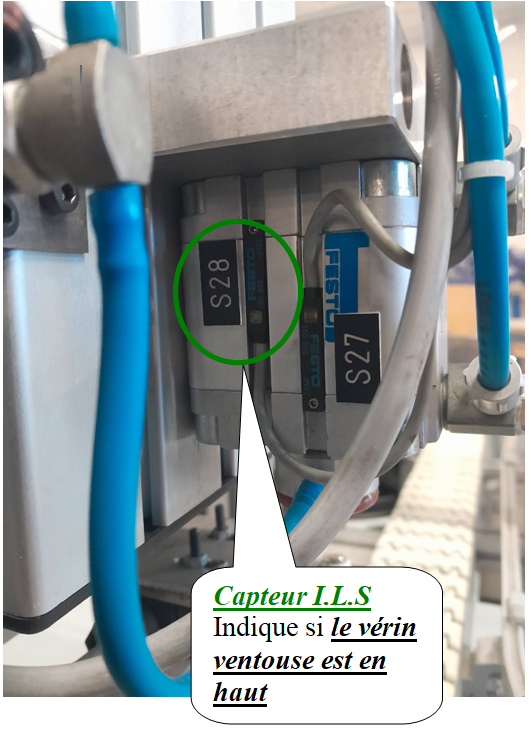Lorsque le vérin de la ventouse est en haut, le capteur S28 envoie une information à l'entrée I1.8 de l'automate A2
