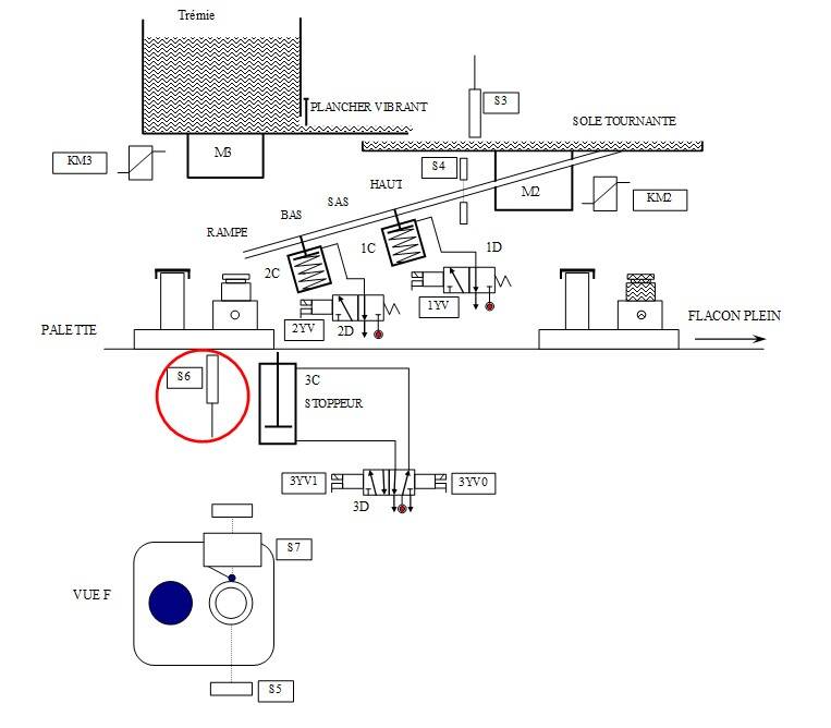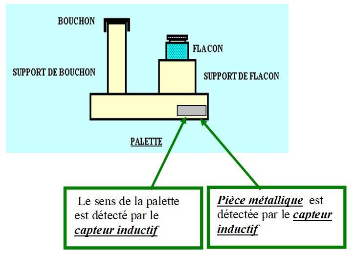 Lorsque la palette arrive au niveau du capteur S6, ce capteur détecte la pièce métallique sous la palette et envoie une information sur l'entré I16 de l'automate A1