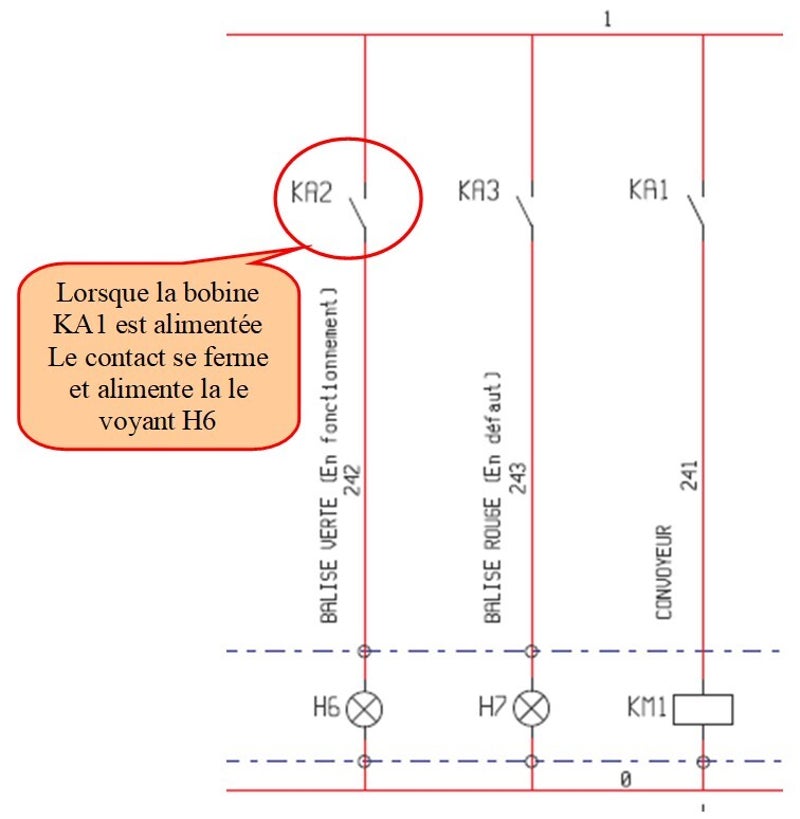 Lorsque la bobine est alimentée le contact, KA2 se ferme et le voyant H6 s'allume